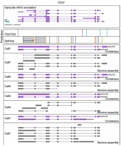 ONT全長(zhǎng)轉(zhuǎn)錄組測(cè)序優(yōu)于Illumina數(shù)據(jù)組裝轉(zhuǎn)錄本isoform的優(yōu)勢(shì)在于從5’端到3’端測(cè)序整個(gè)cDNA分子的能力。雖然如果基因座僅表達(dá)單個(gè)isoform,使用Trinity組裝Illumina數(shù)據(jù)可能會(huì)成功,但它似乎很難分析包含多個(gè)遠(yuǎn)距離替代特征的基因座的多種isoform。例如,ONT RNAseq在所分析的各個(gè)細(xì)胞中鑒定了CD37基因的幾種不同isoform(上圖CD37)。在大多數(shù)情況下,從單個(gè)細(xì)胞組裝Illumina數(shù)據(jù)時(shí),Trinity無法形成完整的重疊群或產(chǎn)生ONT RNAseq未檢測(cè)到的重疊群。因此,CD37基因及其isoform鑒定突出了ONT RNAseq方法的優(yōu)勢(shì),以確定復(fù)雜isoform多樣性,超出了短reads技術(shù)的可能性。