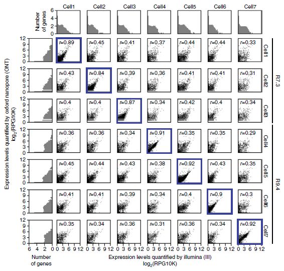 比較相同細(xì)胞的Illumina和ONT RNAseq基因表達(dá)定量結(jié)果,二者間具有高相關(guān)性(ONT R7.3芯片的Pearsonr相關(guān)系數(shù)≥0.84-0.89和升級(jí)版R9.4芯片為0.9-0.92),證實(shí)ONT RNAseq方法可復(fù)現(xiàn)Illumina基因表達(dá)定量。比較不同細(xì)胞中的Illumina和ONT RNAseq基因表達(dá)定量數(shù)據(jù)顯示,Pearsonr≤0.45的低相關(guān)性,表明ONT RNAseq可以鑒定不同細(xì)胞間表達(dá)差異。