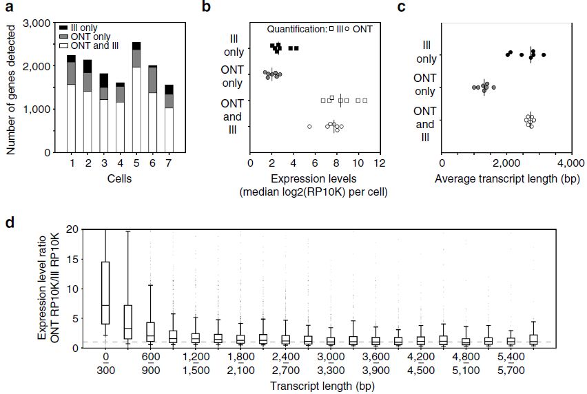 即使產(chǎn)生相對(duì)較少的reads數(shù),ONT RNAseq基因表達(dá)定量也檢測(cè)到了絕大多數(shù)Illumina RNAseq檢測(cè)到的基因(下圖a)。此外,7個(gè)細(xì)胞中的5個(gè),基因表達(dá)檢測(cè)已達(dá)到飽和(下圖S2)。ONT或Illumina RNAseq單獨(dú)檢測(cè)到的基因表達(dá)水平較低,表明這些基因的表達(dá)水平接近兩種技術(shù)的檢測(cè)下限(下圖b)。還觀察到ONT RNAseq單獨(dú)檢測(cè)的基因由較短的轉(zhuǎn)錄本組成(下圖c)。此外,長(zhǎng)度<600bp并且通過ONT和Illumina RNAseq檢測(cè)的基因在Illumina RNAseq數(shù)據(jù)中具有相對(duì)較低的表達(dá)水平(下圖d)。雖然這與在基于Tn5的Illumina文庫制備中強(qiáng)烈選擇的較短轉(zhuǎn)錄本一致,但不能排除ONT RNAseq可能偏向于較短的轉(zhuǎn)錄本。為排除這種可能性,作者進(jìn)一步選擇合成轉(zhuǎn)錄本混合物SIRVs,分析轉(zhuǎn)錄本長(zhǎng)度是否對(duì)ONT RNAseq表達(dá)定量有影響。