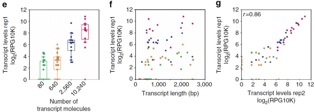 SIRV為已知長(zhǎng)度、結(jié)構(gòu)和序列的人工合成的Spike-in RNA對(duì)照混合物。當(dāng)擴(kuò)增單細(xì)胞級(jí)痕量RNA時(shí),較低濃度組中的轉(zhuǎn)錄本drop-out(很多未檢出表達(dá)),并且轉(zhuǎn)錄本定量顯示每個(gè)濃度組內(nèi)的變化(下圖e,橫坐標(biāo)為4個(gè)不同濃度分組)。然而,重要的是,定量不受轉(zhuǎn)錄本長(zhǎng)度的影響,除了短于500bp的轉(zhuǎn)錄本(下圖f)。通常,ONT RNAseq定量與Spike-in?轉(zhuǎn)錄物濃度一致,轉(zhuǎn)錄本定量的組內(nèi)變異在重復(fù)樣本之間是可重復(fù)的(下圖g)。這種組內(nèi)變異可能是由于初始轉(zhuǎn)錄水平、系統(tǒng)擴(kuò)增偏差或數(shù)據(jù)分析偏差導(dǎo)致。分析這些不同濃度的合成轉(zhuǎn)錄本使作者排除了ONT RNAseq有利于較短轉(zhuǎn)錄本定量的可能性,可對(duì)長(zhǎng)度為500-2,500 bp的SIRV轉(zhuǎn)錄本進(jìn)行大規(guī)模無偏倚定量。