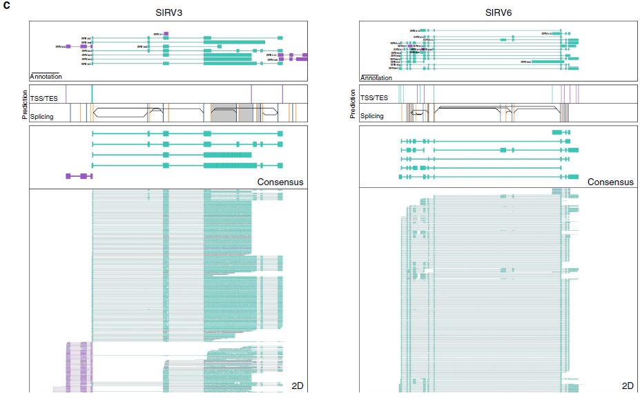 人工合成標(biāo)準(zhǔn)品?Spike-in RNA Variant Control Mixes (SIRVs, Lexogen,根據(jù)7個(gè)人類基因結(jié)構(gòu)設(shè)計(jì)而成的,其中每個(gè)基因結(jié)構(gòu)有6-18種轉(zhuǎn)錄本變異,因此總共有69種轉(zhuǎn)錄本,這些轉(zhuǎn)錄本全面的解決了可變剪接、可變轉(zhuǎn)錄起始點(diǎn)和終止位點(diǎn)、重疊基因和反義轉(zhuǎn)錄問題),分別進(jìn)行二代Illumina轉(zhuǎn)錄組測(cè)序和三代ONT全長(zhǎng)轉(zhuǎn)錄組測(cè)序,二者間進(jìn)行比較。