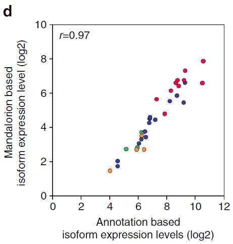 根據(jù)其TSS/TES和可變剪接位點(diǎn)的使用將ONT reads分類為isoform組,并生成一致性序列,共計(jì)33個(gè)一致性序列,與其對(duì)應(yīng)的SIRV轉(zhuǎn)錄本之間具有97.8-100%相似性,且方向一致。26個(gè)一致性序列匹配2個(gè)高豐度組中存在的29個(gè)SIRV轉(zhuǎn)錄本之一(下圖c)。不依賴于基因組注釋的轉(zhuǎn)錄本isoform?Mandalorion分類定量與reads直接與轉(zhuǎn)錄組比對(duì)得到的定量結(jié)果之間的高度相關(guān)性(下圖d)。