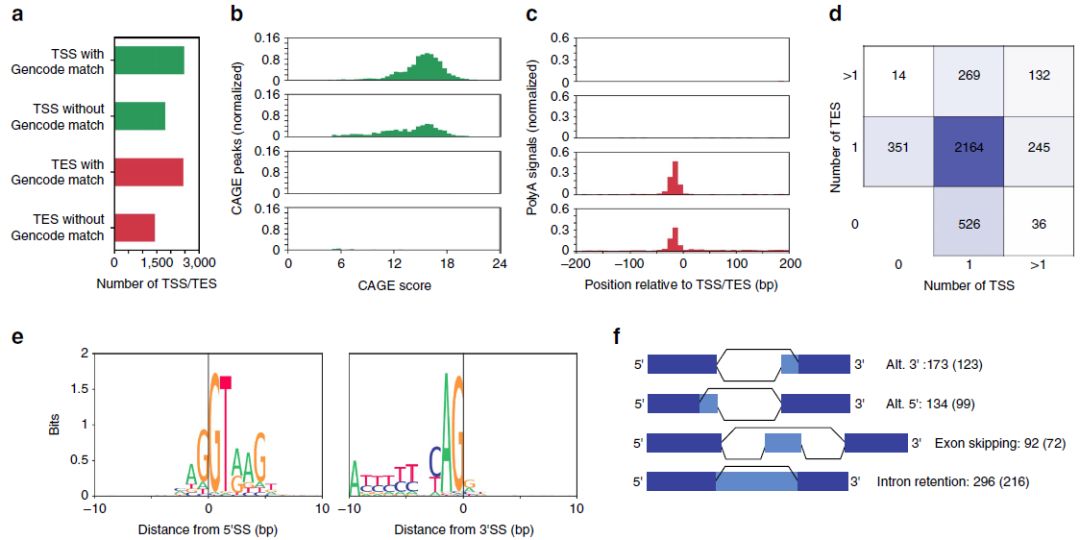 總共鑒定到24,887個(gè)5’剪接位點(diǎn)(SS)和24,756個(gè)3’剪接位點(diǎn)。絕大多數(shù)這些剪接位點(diǎn)由Illumina junction reads或GENCODE注釋支持。24,298(97.6%)個(gè)5’SS和24,220(97.8%)個(gè)3’SS分別與GENCODE注釋匹配。在與GENCODE注釋不匹配的589個(gè)5’SS和536個(gè)3’SS中,分別有250(42.4%)個(gè)5’SS和216(40.2%)個(gè)3’SS由在Illumina junction reads支持。就算假設(shè)所有無GENCODE注釋或Illumina reads支持的剪接位點(diǎn)都是假的(顯然這是不可能的),該方法的錯(cuò)誤發(fā)現(xiàn)率僅為1.3%(659/49,643)。ONT RNAseq在確定√確剪接位點(diǎn)方面相對(duì)成功(上圖e為剪接位點(diǎn)堿基上下文context)。作者發(fā)現(xiàn)了296個(gè)內(nèi)含子保留事件,134個(gè)可選的5’剪接位點(diǎn)和173個(gè)可選的3’剪接位點(diǎn)組合。大多數(shù)這些事件也在Illumina reads中觀察到,illumina reads支持216個(gè)(/296個(gè))內(nèi)含子保留事件,99個(gè)(/134個(gè))可選5’剪接位點(diǎn),123個(gè)(/173個(gè))可選3’剪接位點(diǎn)和72個(gè)(/92個(gè))外顯子跳躍事件(上圖f)。