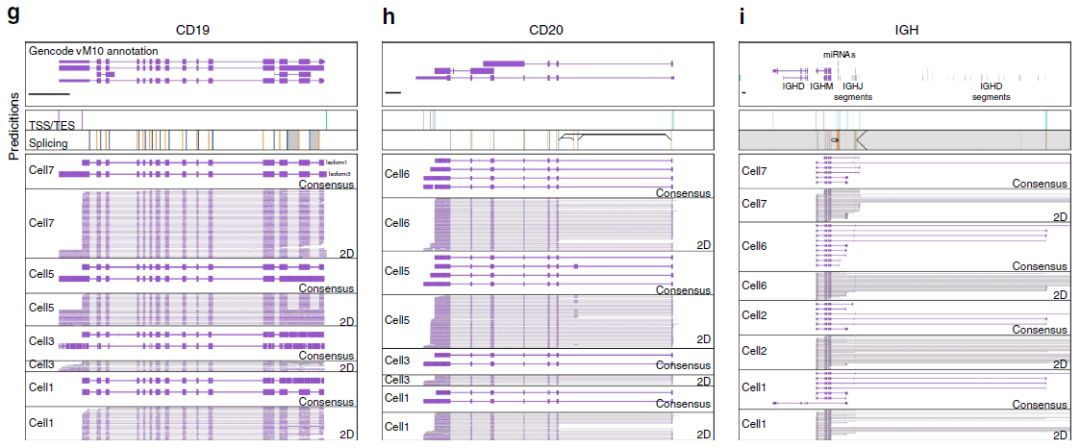 表達(dá)復(fù)雜isoform的基因定義為:含有可變TSS/TES和可變剪接位點(diǎn)的基因。共計(jì)鑒定了169種表達(dá)復(fù)雜isoform的基因。其中55個(gè)基因在細(xì)胞之間存在高度顯著差異isoform使用,包括B細(xì)胞特異性表面受體CD19和CD20,抗體重鏈基因座(IGH)(下圖g-i),CD37(下圖CD37),以及CD2和CD79b,以及CD45。各個(gè)B1a細(xì)胞中,來自CD19的同種型顯示出可變TSS和內(nèi)含子保留事件的組合。另一方面,來自CD20的同種型顯示出可選擇性TES的組合,以及包括先前未注釋外顯子的外顯子跳躍事件。IGH基因座更復(fù)雜,具有包含VDJ重組和IGHM恒定區(qū)外顯子的典型isoform。觀察到了含有IGHM恒定區(qū)外顯子的isoform,但是源自(1)流產(chǎn)性DJ重組(2)I-外顯子(3)IGHM轉(zhuǎn)換區(qū)miRNA基因座(4)J-區(qū)段。最后,細(xì)胞1中的一種isoform來自IGHM I-外顯子,但含有IGHD恒定區(qū)外顯子。雖然之前已觀察到IGH isoform多樣性并且長(zhǎng)期以來已知其參與類別轉(zhuǎn)換,但ONT RNAseq在單細(xì)胞水平上測(cè)序全長(zhǎng)cDNA的能力確實(shí)突出并證實(shí)了?IGH基因座特殊的轉(zhuǎn)錄多樣性。