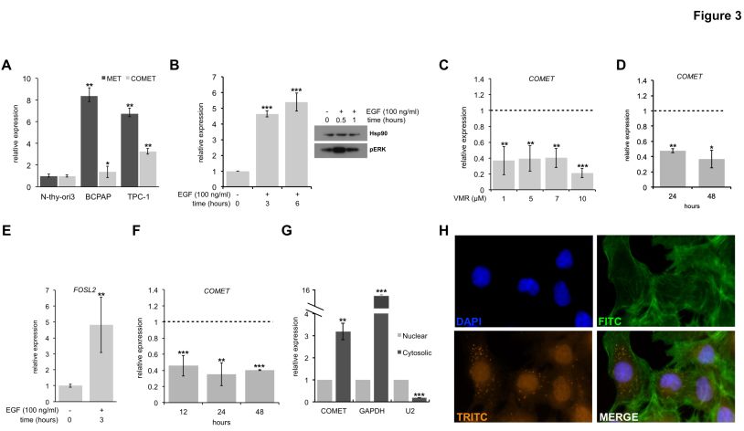 BRAF樣PTC的特征在于ERK介導(dǎo)的轉(zhuǎn)錄程序的過度激活。這一點促使研究COMET表達是否在MAPK激活下游被誘導(dǎo)。因此,用表皮生長因子(EGF)刺激Nthy-ori 3-1細胞中的RAS-RAF-MEK-ERK途徑。MAPK途徑的誘導(dǎo) – 通過早期p-Erk增加證實(圖3B,右圖) – 隨后COMET水平顯著增加(圖3B,左圖)。相反,使用化學(xué)和遺傳方法抑制BRAF突變的BCPAP細胞系中的組成型活性途徑,通過用vemurafenib阻斷過度活化的B-Raf蛋白(圖3C)或BRAF基因KD(圖3D),顯著降低COMET水平。之后評估了COMET細胞定位,與qPCR偶聯(lián)的RNA分級分析顯示,與內(nèi)參蛋白質(zhì)編碼基因(GAPDH)類似,COMET在細胞質(zhì)RNA部分中具有明顯富集(圖3G)。此外,RNA FISH進一步證實了這種新的NAT lncRNA的細胞質(zhì)定位(圖3H)。