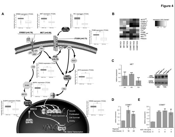 為了預(yù)測COMET的功能并確定其在乳頭狀甲狀腺癌中的潛在生物學(xué)意義,基于共犯原則進行分析。利用基于TCGA的lncRNA圖譜TANRIC,使用Pearson相關(guān)性評估甲狀腺癌樣本中的COMET表達是否與其他基因的表達相關(guān)。與初步發(fā)現(xiàn)一致,用鄰近癌基因MET檢測出最高相關(guān)值(r = 0.88)。此外,對與COMET顯著相關(guān)(FDR <0.05;r≥0.7)的基因進行的通路分析顯示MAPK通路的富集,并且有趣的是,其中一些在來自TCGA的PTC樣品的BRAF樣群中過表達( 圖4A)。