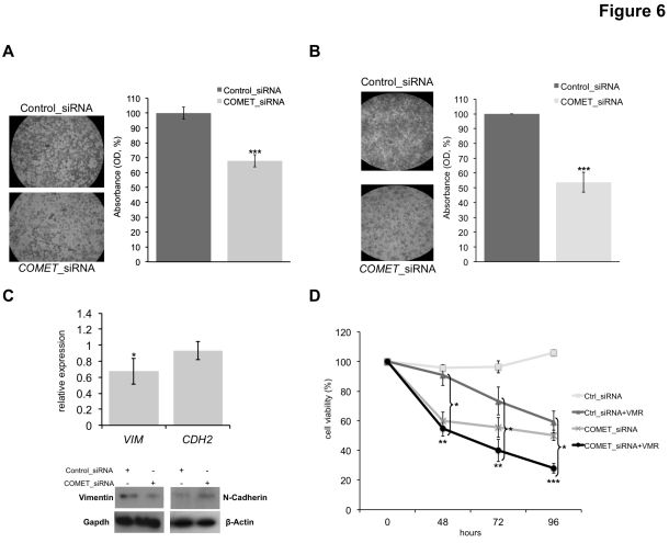 據(jù)報道,受體酪氨酸激酶(RTK),特別是c-Met受體的激活是腫瘤細胞逃避vemurafenib(VMR,維莫非尼)介導(dǎo)的突變體B-Raf蛋白抑制的機制。由于作者數(shù)據(jù)支持COMET可作為MET新的調(diào)節(jié)劑,猜測它是否也可能作用于BRAF突變的腫瘤細胞中的vemurafenib反應(yīng)機制。首先,與TPC-1細胞類似,評估COMET沉默對BRAFV600E突變的BCPAP細胞系的生存力(高達50%)具有強烈影響(圖6D),伴隨MET水平的下降。當用VMR處理BCPAP時,也表現(xiàn)出了類似的效果(高達60%的細胞存活率降低)。因此,將敲低COMET的BCPAP細胞暴露于VMR,以評估組合治療是否可發(fā)揮累加效應(yīng)。有趣的是,圖6D中數(shù)據(jù)表明,與對照細胞(即僅用VMR處理和/或用對照siRNA轉(zhuǎn)染的細胞,圖6D)相比,COMET敲低的 BCPAP細胞具有顯著增強的VMR敏感性,表明在BRAFV600E突變腫瘤中COMET是提高化療的新靶標。