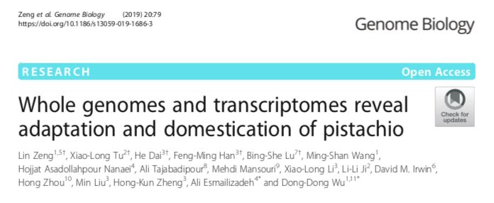 2019年04月18日,Genome Biology在線發(fā)表了中國科學(xué)院昆明動(dòng)物研究所與北京百邁客生物科技有限公司共同合作文章“Whole genomes and transcriptomes reveal adaptation and domestication of pistachio” 中國科學(xué)院昆明動(dòng)物研究所研究員吳東東為本文通訊作者,中國科學(xué)院昆明動(dòng)物研究所曾琳,北京百邁客公司大項(xiàng)目負(fù)責(zé)人韓鳳鳴,戴鶴為共同第一作者。本文繪制了開心果的基因組草圖,并對其進(jìn)行了大規(guī)模的基因組重測序并進(jìn)行了比較基因組分析,表明,開心果的應(yīng)激適應(yīng)可能與細(xì)胞色素P450和幾丁質(zhì)酶基因家族的擴(kuò)增有關(guān)。尤其重要的是,比較轉(zhuǎn)錄組學(xué)分析表明茉莉酸(JA)生物合成途徑在開心果耐鹽性中起著重要作用。此外,研究人員對93個(gè)栽培種和14個(gè)野生種(P. vera)基因組及35個(gè)親緣關(guān)系密切的野生黃連木屬基因組進(jìn)行了重測序,以提供對種群結(jié)構(gòu)、遺傳多樣性和馴化的見解與思路。