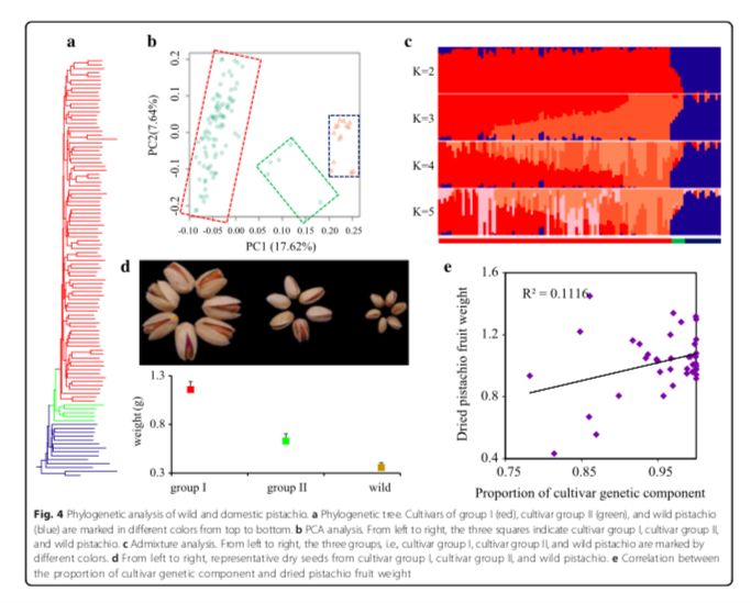 基于重測序數(shù)據(jù),研究人員推測了這些物種的有效群體大小的變化,并發(fā)現(xiàn)在 Pleistocene期間發(fā)生了瓶頸事件,且在 ~200 kyr前,有效群體大小增加。系統(tǒng)發(fā)育樹顯示馴化和野生開心果之間的分離(圖4a)。利用δaδi推算野生和馴化開心果的分化時(shí)間在 ~8000年前,這與早在公元前6750年就表明開心果種子是一種常見的食物這一考古記錄相似。為了深入了解開心果種質(zhì)之間的遺傳關(guān)系,研究人員進(jìn)行了兩項(xiàng)經(jīng)典分析:群體結(jié)構(gòu)和主成分分析(圖4b,c)。這些分析清晰的顯示栽培種質(zhì)分為兩個(gè)群。栽培種Group I的LD最高,栽培種Group II和野生開心果的LD衰減值相近。Group II包括 Qazvini,Italiaei和Badami