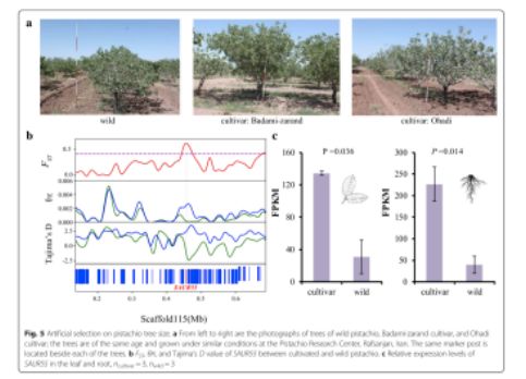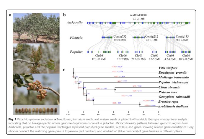 在本研究中,為了更好地了解開心果馴化的分子進(jìn)化歷史,研究人員組裝了開心果的基因組草圖,并對107個(gè)全基因組進(jìn)行了重測序,包括93個(gè)馴化和14個(gè)野生的開心果以及35個(gè)不同野生黃連木屬物種。整合基因組和轉(zhuǎn)錄組學(xué)分析顯示,擴(kuò)張的基因家族(如細(xì)胞色素P450和幾丁質(zhì)酶)和茉莉酸(JA)生物合成途徑可能參與應(yīng)激適應(yīng)。比較群體基因組分析顯示,開心果大約在8000年前被馴化,馴化的關(guān)鍵基因可能是那些涉及樹木和種子大小的基因,這些基因經(jīng)歷了人工選擇。這些基因組序列應(yīng)該有助于未來的研究,以了解沙漠作物的農(nóng)業(yè)和環(huán)境相關(guān)特性的遺傳基礎(chǔ)。