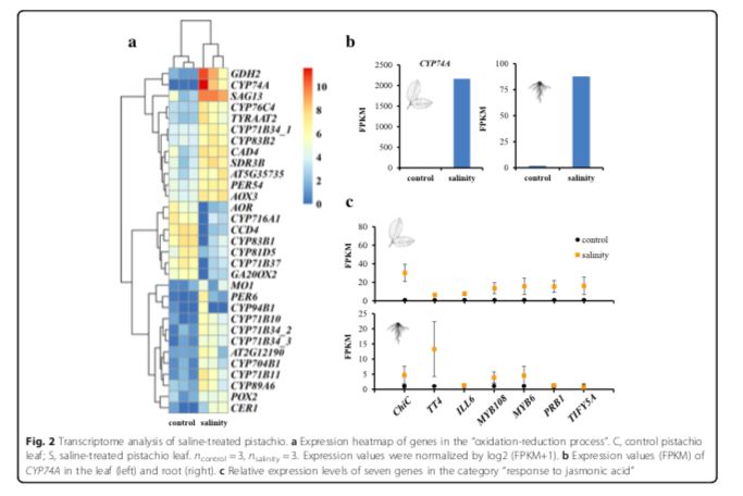 進(jìn)一步研究開心果的耐鹽性潛在遺傳機(jī)制,研究者進(jìn)行了鹽度實(shí)驗(yàn)。開心果砧木(P.vera?L.cv.Ohadi)的葉和根在正常條件和鹽度條件下進(jìn)行RNA測序。使用Tophat-Cufflinks-Cuffdiff?pipeline,在鹽水條件下處理的植物與對照之間表現(xiàn)出差異表達(dá),鑒定214和461蛋白質(zhì)編碼基因分別在葉和根組織中(ncontrol = 3, nsalinity = 3, corrected P < 0.05,)?;蚋患治霭l(fā)現(xiàn)許多差異表達(dá)基因(31個(gè)基因)參與到“氧化還原進(jìn)程”中(圖2a,b)。像比較基因組分析一樣,該類別中的15個(gè)基因是細(xì)胞色素P450基因,特別是CYP74A(即AOS),其編碼細(xì)胞色素P450 CYP74基因家族的一個(gè)成員,其起到丙二烯氧化物合酶(AOS)的作用。這種酶催化茉莉酸酯合成中的第一步[即茉莉酸(JA)]。AOS中每千堿基外顯子的表達(dá)片段(FPKM)值在葉片中從對照中的近0增加到鹽水條件下的2163.75,在根中從對照中的1.87增加到鹽水處理的87.74。研究者還發(fā)現(xiàn)了7個(gè)差異表達(dá)的基因(ChiC, TT4, ILL6, MYB108, MYB6, PRB1, and TIFY5A)被富集到“茉莉酸反應(yīng)”中。以前的研究表明,干旱和高鹽度導(dǎo)致水稻葉片和根部JA含量增加。鹽度處理可以增加濕地物種鳶尾(Iris hexagona)中的內(nèi)源JA水平。茉莉酸酯激活植物對生物脅迫(即病原體攻擊)和非生物脅迫(即鹽)的反應(yīng)。在此,用鹽水處理增加了在葉和根中參與茉莉酸反應(yīng)的這些基因的表達(dá)水平(圖2c)。這些基因的表達(dá)增加(例如,AOS作為酶催化茉莉酸酯合成中的第一步)應(yīng)該增加茉莉酮酸酯的合成,因此,它們很可能被開心果用于應(yīng)對鹽脅迫。