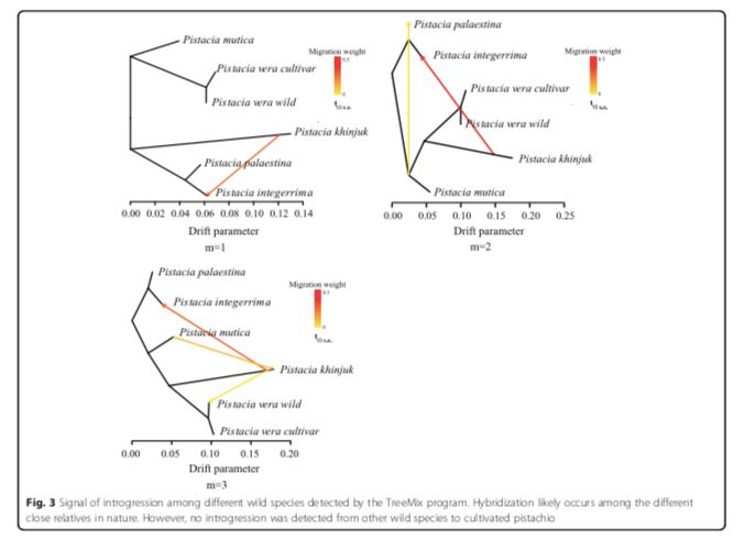 為了研究開心果的種群歷史和適應(yīng)性進(jìn)化,研究者對107個(gè)開心果基因組進(jìn)行重測序,包括93個(gè)品種和14個(gè)野生開心果,平均測序深度為6-8X。作者還重新測序了來自不同近緣種的35個(gè)基因組,包括P.mutica,P.khinjuk,P.integerrima和P. palaestina。用stringent GATK pipeline,發(fā)現(xiàn)14.77百萬個(gè)單基因變異位點(diǎn),其中2.42百萬個(gè)在基因區(qū)。使用鄰近法和最大似然法的系統(tǒng)發(fā)育分析清楚地分離了5種不同的種群,即?P.vera, P.mutica, P. khinjuk, P. integerrima, and P. palaestina。通過TreeMix程序在一些物種之間檢測到漸滲的信號(hào),這表明雜交可能在自然界中的不同近親之間發(fā)生,并且與植物中被發(fā)現(xiàn)的普遍雜交一致。然而,從其他開心果物種到馴化的開心果沒有檢測到漸滲,這種現(xiàn)象來源于野生的P. vera(圖3)。