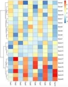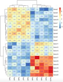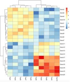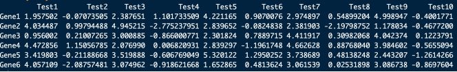 為了模擬不同樣品和基因之間的差異,我們將第一行到第10行中奇數(shù)列的數(shù)值全部加3,將第11行到第20行的偶數(shù)列數(shù)值全部加2,將15行到20行的偶數(shù)列全部加4。最后將列名命名為T(mén)est1 ~ Test10,將行名命名為Gene1~Gene 20,最終生成的數(shù)據(jù)格式如下圖