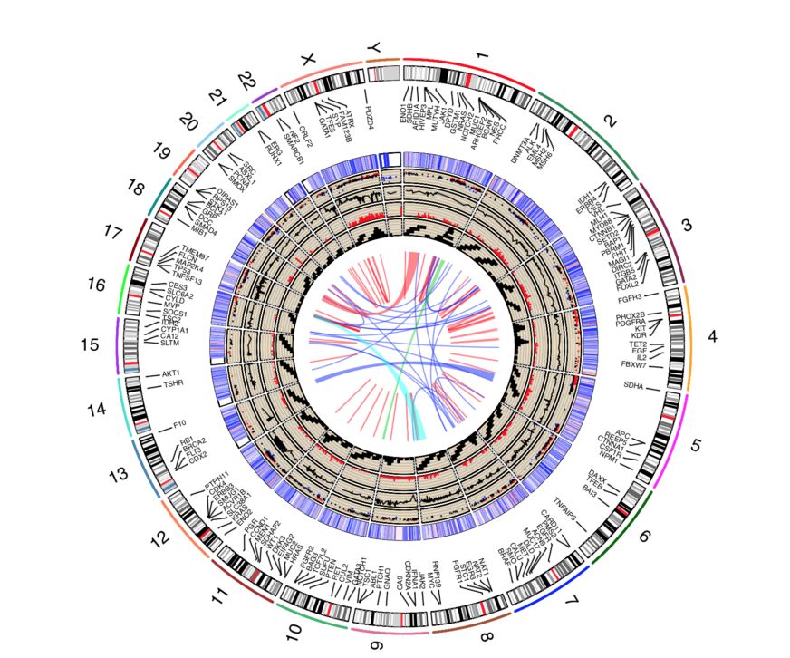 Circos圖是在基因組相關的分析結果展示中非常常見的一類圖型。由于Circos圖中展示的信息量大,圖形十分美觀,很多文章中都會繪制類似的圖形。從圖形的內容來看,Circos圖實際是將多個類型的圖片,包括散點圖、直方圖、折線圖、熱圖等,經過變形以后疊加顯示在染色體上。本質上是多個圖形的組合。