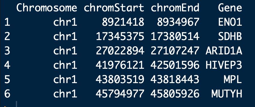 #?這個數據集是染色體片段突變頻率的數據,數據內容如上圖,第一列?染色體編號;第二列?染色體片段起始位點;第三列?染色體片段結束位點;第四列?染色體片段突變頻率