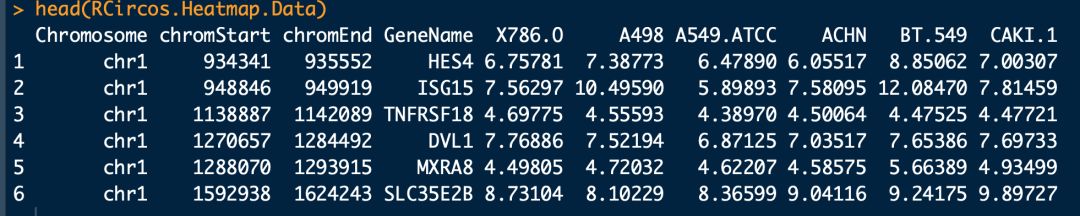 #?這個數據集中是6個不同樣本的基因表達量數據,數據內容如上圖,第一列?染色體編號,需要與第一步導入的染色體數據一致;第二列?基因在染色體片段起始位點;第三列?基因在染色體片段結束位點;第四列?基因名;第五列及以后?基因在不同樣本中的表達量
