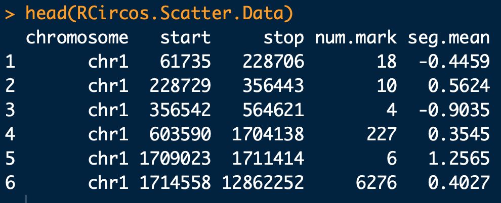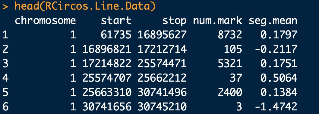 #?這個數據集是拷貝數變異的數據,數據內容如上圖,第一列?染色體編號,需要與第一步導入的染色體數據一致;第二列?突變位點在染色體片段起始位點;第三列?突變位點在染色體片段結束位點;第四列?突變位點拷貝數;第五列?突變平均置信度