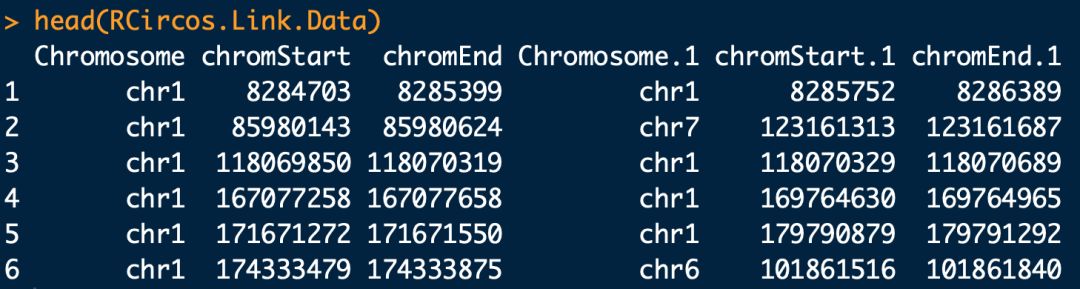 #?數據內容如上圖,第一列?染色體編號;第二列?聯(lián)系位點在染色體片段的起始位點;第三列?聯(lián)系位點在染色體片段的結束位點;第四列?聯(lián)系位點在所在的另一個染色體編號;第五列?聯(lián)系位點在所在的另一個染色體片段的起始位點;第六列?聯(lián)系位點在所在的另一個染色體片段的結束位點