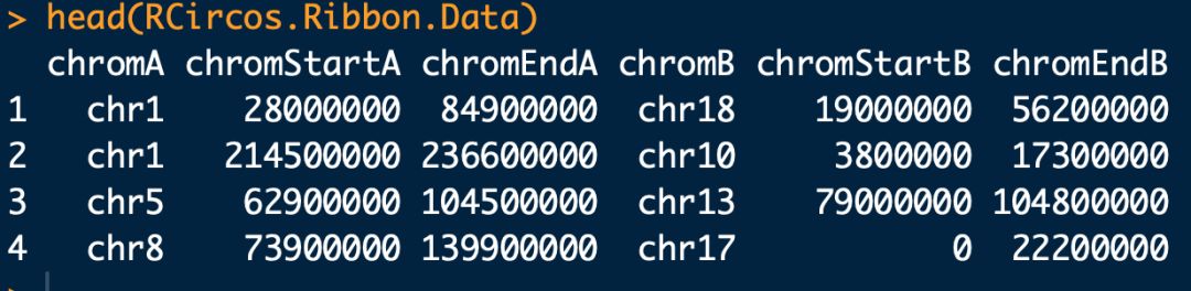 # 這個數據是RCicos內置的人類染色體信息,第四列和第五列信息用于展示染色體的核型??梢允÷?。