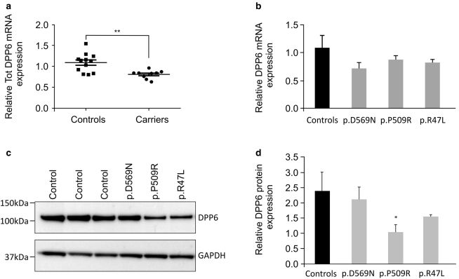 只有3個(gè)攜帶DPP6無(wú)義突變的患者的解剖大腦被凍存。這三個(gè)患者的神經(jīng)病理學(xué)診斷分別是阿爾茲海默癥AD,F(xiàn)TLD-TDP typeD(FTD行為變異和佩吉特氏骨?。?,F(xiàn)TLD-ALS type B(FTD行為變異及球類(lèi)型)。結(jié)果發(fā)現(xiàn)三個(gè)DPP6變異(p.P509R, p.R47L, and p.D596N)?的mRNA表達(dá)水平顯著下調(diào),并且發(fā)現(xiàn)p.P509R和p.R47L 攜帶者的DPP6蛋白表達(dá)水平也顯著下降。