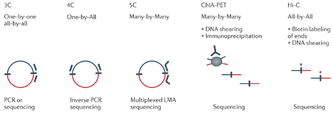同樣源于3C的用以研究染色體互作的技術(shù)還包括4C(“circular?3C”或“3C-on-Chip”)、5C(Chromosome?conformation?capture?carbon?copy)?、ChIA-PET(chromatin?interaction?analysis?by?paired-end?tag?sequencing)?,不同的3C衍生技術(shù)的區(qū)別在于捕獲的連接片段檢測(cè)和定量方式。