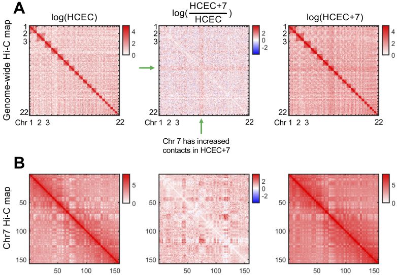作者研究了一個(gè)正常核型的健康結(jié)腸粘膜構(gòu)建的細(xì)胞系及其同源的衍生細(xì)胞系,該衍生細(xì)胞系唯一異常是有一個(gè)額外的7號染色體拷貝(47,XY,+7)。作者使用Hi-C、RNA測序和蛋白質(zhì)組分析研究了非整倍化后結(jié)構(gòu)、功能的變化及其關(guān)系。7號染色體的增加導(dǎo)致了該染色體基因轉(zhuǎn)錄水平的增加,以及全基因組基因和蛋白表達(dá)的變化。Hi-C分析表明,7號染色體的額外拷貝反映在三倍體染色體間有更多的染色體間互作,且全基因組范圍內(nèi)出現(xiàn)了染色質(zhì)組織的變化,包括A/B區(qū)域化和拓?fù)潢P(guān)聯(lián)域(TAD)邊界的變化。最值得注意的是,4號染色體顯示出染色質(zhì)組織的嚴(yán)重缺失,而14號染色體包含一個(gè)大的A/B?compartment轉(zhuǎn)換區(qū)域,同時(shí)其中的基因表達(dá)發(fā)生改變。間期FISH檢測染色體涂染探針距離發(fā)現(xiàn)額外的7號染色體區(qū)域的核位置未發(fā)生變化。此外衍生細(xì)胞系中基因和蛋白富集在惡性轉(zhuǎn)化的關(guān)鍵信號通路,如HGF/MET-axis。總之,一個(gè)特異的染色體非整倍體對核結(jié)構(gòu)和功能有重大影響,無論是局域的還是全基因組的,此研究為分析具有復(fù)雜核型的癌癥核組織提供了一個(gè)基礎(chǔ)。