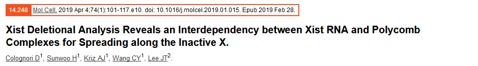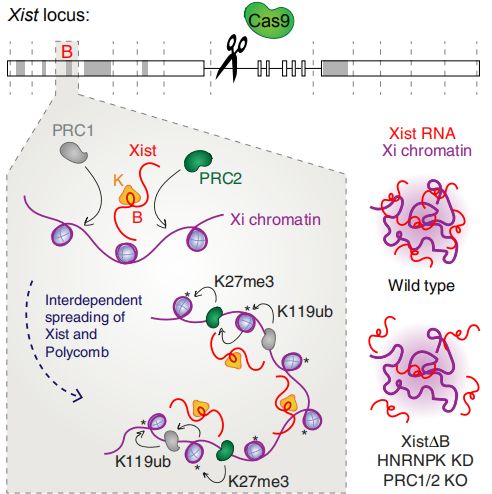 在X染色體失活期間,Xist RNA傳播包覆整個(gè)染色體,以建立沉默,但是參與傳播的功能RNA元件及機(jī)制仍未確定。作者通過一個(gè)全面的內(nèi)源性Xist缺失研究,發(fā)現(xiàn)Repeat B 對于在Xist的傳播和多梳狀復(fù)合物1和2 (PRC1/PRC2)的作用至關(guān)重要,會影響染色體的三維結(jié)構(gòu)。刪除Repeat B或其直接結(jié)合伴侶HNRNPK會影響PRC1和PRC2的招募。反過來,去除PRC1或PRC2又會削弱Xist的傳播。因此,Xist和多梳狀復(fù)合物傳播包覆整個(gè)染色體時(shí)具有彼此依賴性,這三個(gè)因子對于X染色體失活至關(guān)重要,且三者是密不可分的。