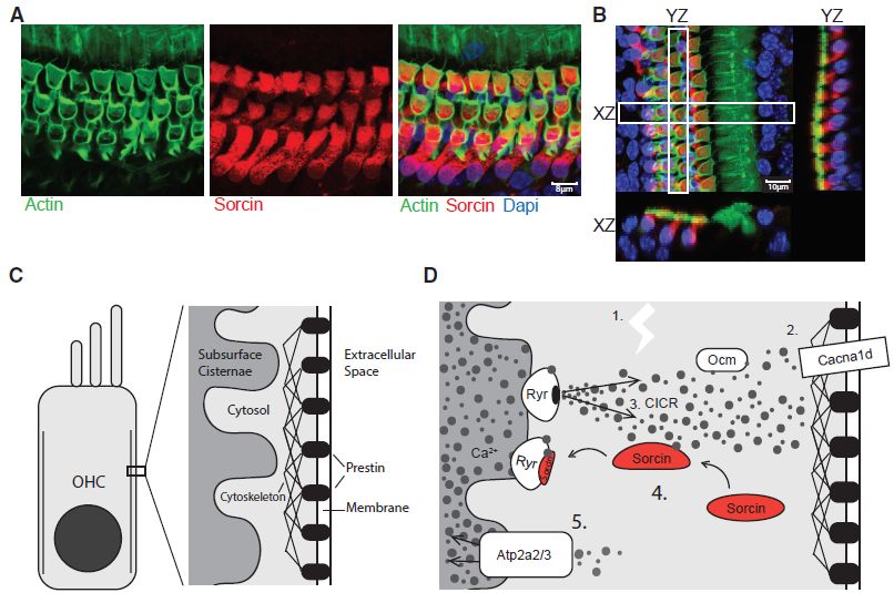 免疫熒光僅將sorcin僅定位于OHC(圖3A,3B),假設類似的機制可以調節(jié)基于prestin的運動(圖3C和3D,動力蛋白?Prestin是一種高度專業(yè)化的蛋白質,可以起到驅動耳蝸中外部毛細胞的作用,使耳蝸可以讓人們和動物聽到聲音)。與此可能性一致,作者確定了在OHCs中表達sorcin介導的興奮-收縮途徑的基本組分,包括(1)電壓門控鈣釋放通道,(2)促進CICR的通道,(3)終止CICR的機制(sorcin),和(4)鈣泵使釋放的Ca2+返回Ca2+儲庫(圖3E)。本數據集和他人數據集中檢測到的第一個組分是耳聾基因Cacna1d,一種在OHCs中高表達的電壓門控鈣釋放通道,參與心動過緩有關的綜合征性耳聾;第二個組分,即促進CICR的通道,包括Ryr1、Ryr2和Ryr3。在通過Ryr通道誘導CICR后,sorcin的作用可能是通過在Ca2+存在下阻斷Ryr受體來快速終止CICR,這是先前在心肌細胞中報道的途徑。已知定位于OHC表面下池的Ca2+?ATP酶泵可從細胞溶質中除去Ca2+。附著蛋白質(Ocm)等結合并緩沖Ca2?+的輔助蛋白質可能有助于這一過程。
