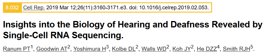 參考文獻:Ranum?P?T,?Goodwin?A?T,?Yoshimura?H,? et?al.?Insights?into?the?Biology?of?Hearing?and?Deafness?Revealed?by? Single-Cell?RNA?Sequencing[J].?Cell?reports,?2019,?26(11):?3160-3171.? e3.