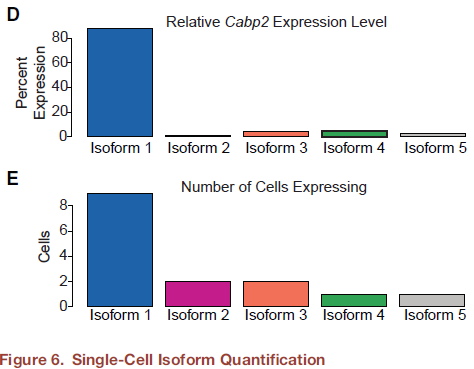 為了解決全長isoform結構,進行了ONT全長轉錄組測序,并使用Illumina短reads序列數據作為確認的scaffold,用于nonopore長讀長數據比對。與150-800bp片段大小的Illumina?reads不同,Nanopore測序不需要片段化文庫,并且可以產生跨越mRNA轉錄本長度的單一reads(圖6A和6B)。對p15時間點的12個OHC細胞加barcaod以在4個MinION?R9.4?flow?cell上測序所有樣品,同時保持單細胞分辨率(圖6A)。因為OHCs是最多和最差異的Illumina數據集,這有助于跨平臺比較以驗證長reads和isoform定量。