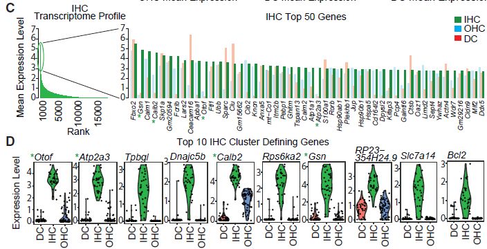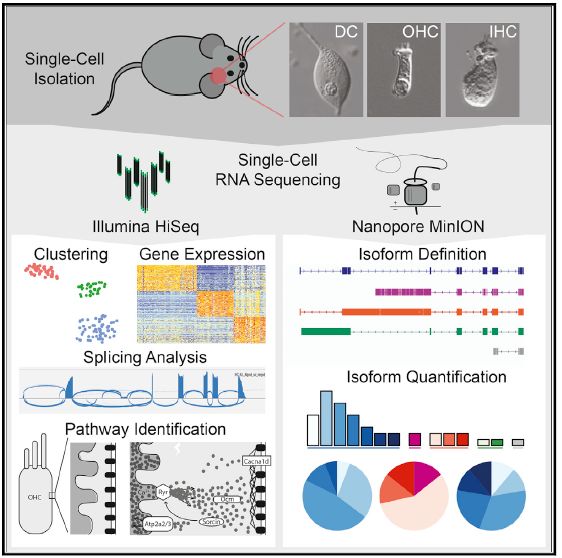 2、SmartSeq2單細胞擴增,IHC?(n?=?42),?OHC?(n?=?127),?and?DC?(n?=?39)進行二代Illumina平臺轉錄組測序;12個p15小鼠OHCs進行ONT全長轉錄組測序。