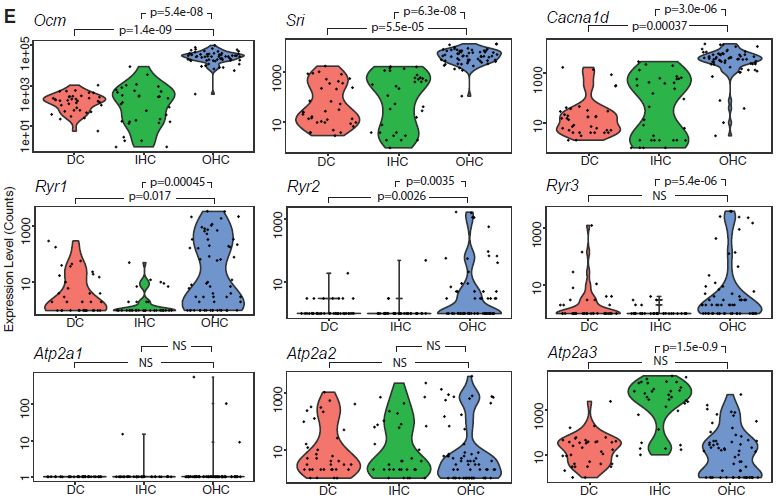 已知細胞類型marker基因高度差異表達,例如prestin(Slc26a5),其在OHCs中穩(wěn)健且差異表達。與公布的OHC和IHC轉錄組數據進行比較,搜索具有不一致排名的基因,假設通過AUC而不是表達水平對基因進行排序將在更廣泛的表達水平上鑒定細胞類型定義基因。按AUC分類排名時,兩個鈣相關基因Ocm和Sri在OHC定義基因列表中排名第一,甚至超過Slc26a5,排名第三(上圖2F)。先前已在OHC中報道了Ocm的表達。編碼蛋白質oncomodulin(癌調蛋白)是鈣結合蛋白家族成員之一,它是耳蝸聽力擴增所必需的。Sri編碼sorcin(可溶性耐藥相關鈣結合蛋白),一種在心肌細胞中表達的蛋白質,是鈣介導的興奮-收縮偶聯所必需的,通過抑制Ryr通道(Ca2+釋放通道/RyR受體)進行鈣離子介導的鈣離子釋放?(CICR)。在肌細胞中,Ryr通道介導CICR,能夠從肌質網中快速釋放Ca2+離子,從而產生對于肌肉收縮必不可少的時空限制性鈣火花。