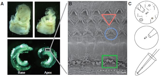 1、從p15、p30、p70和p228雄性和雌性C3-Heb/FeJ小鼠(Mus?musculus)收獲耳蝸組織,倒置顯微鏡下鑒定并使用顯微操作吸管法分離目的細胞:IHCs、OHCs和Deiters細胞(Deiters’?cells,DCs)。(內毛細胞(inner?hair?cells,IHCs)和外毛細胞(outlier?hair?cells,OHCs);Deiters細胞是哺乳動物耳蝸內的一種支持細胞,與外毛細胞(OHC)的關系非常密切。)