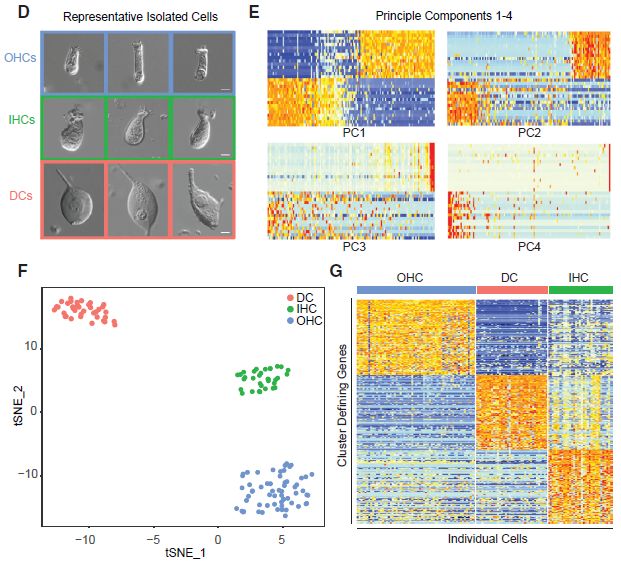 使用Seurat進行基于主成分1和2的無偏差聚類(圖1E)。得到的tSNE?clusters顯示IHC、OHC和DC分離明顯,形成與其形態(tài)學分組一致的無偏細胞特異性組(圖1F)。為了鑒定每種細胞類型的特征性表達模式,在AUC分類器下為每種細胞類型提取了前100個cluster定義基因(圖1G)。