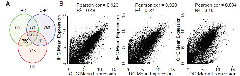 為了比較細胞類型之間表達譜,計算各cluster內所有細胞中每個基因平均表達水平。通過維恩圖對平均表達譜比較,每種細胞類型約表達700個特異基因(OHC-753;?IHC-655;?DC-713;歸一化后counts>10)。且發(fā)現IHCs和DC具有高比例重疊(共享750個基因,與OHC和DC共享564個基因相比),但是IHC和OHC共享771個基因表達(圖2A)。為了更嚴格地測試每種細胞類型的轉錄相似性,使用所有基因進行Pearson相關和R2回歸分析?;貧w分析,所有3組間比較中發(fā)現了強相關性,OHCs和IHC之間的相關性最高,OHCs和DC之間的相關性最低。OHC和DC表達譜最不相似可能反映了OHC高水平特化(圖2B)。