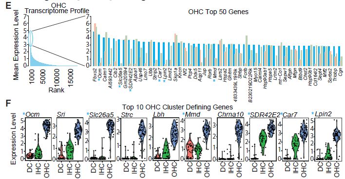 單細胞RNA-seq可鑒定內毛細胞(inner?hair?cells,IHCs)和外毛細胞(outlier?hair?cells,OHCs)定義基因;
