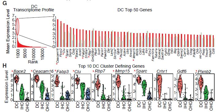 與哺乳動物耳蝸中的各種支持細胞類型相比,聽覺HC的豐度較低。為了估計小鼠耳蝸膜迷路中可用于單細胞分離的HC數量,據報道在成熟的小鼠耳蝸中約765個IHCs,通過對小鼠顳骨中心切片,細胞核計數,估計小鼠膜性迷路中的細胞數為415,395,其中IHC和OHC比例僅為0.19%和0.59%。