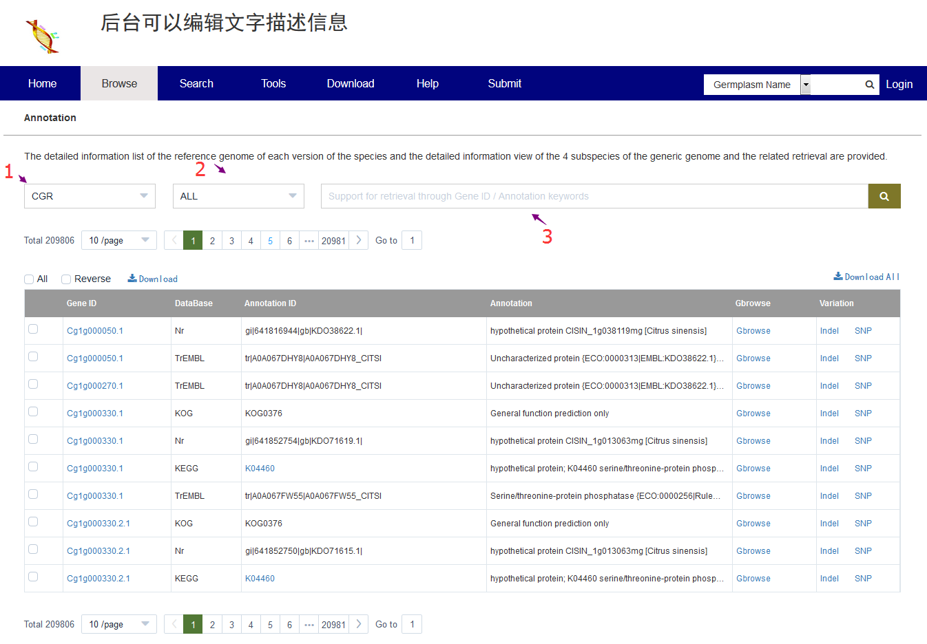 標(biāo)準(zhǔn)版Browse模塊中共部署了7個(gè)子模塊進(jìn)行核心數(shù)據(jù)的瀏覽,如Browse中的Annotation模塊,鏈接:http://tomato.biocloud.net/page/browse/Annotation