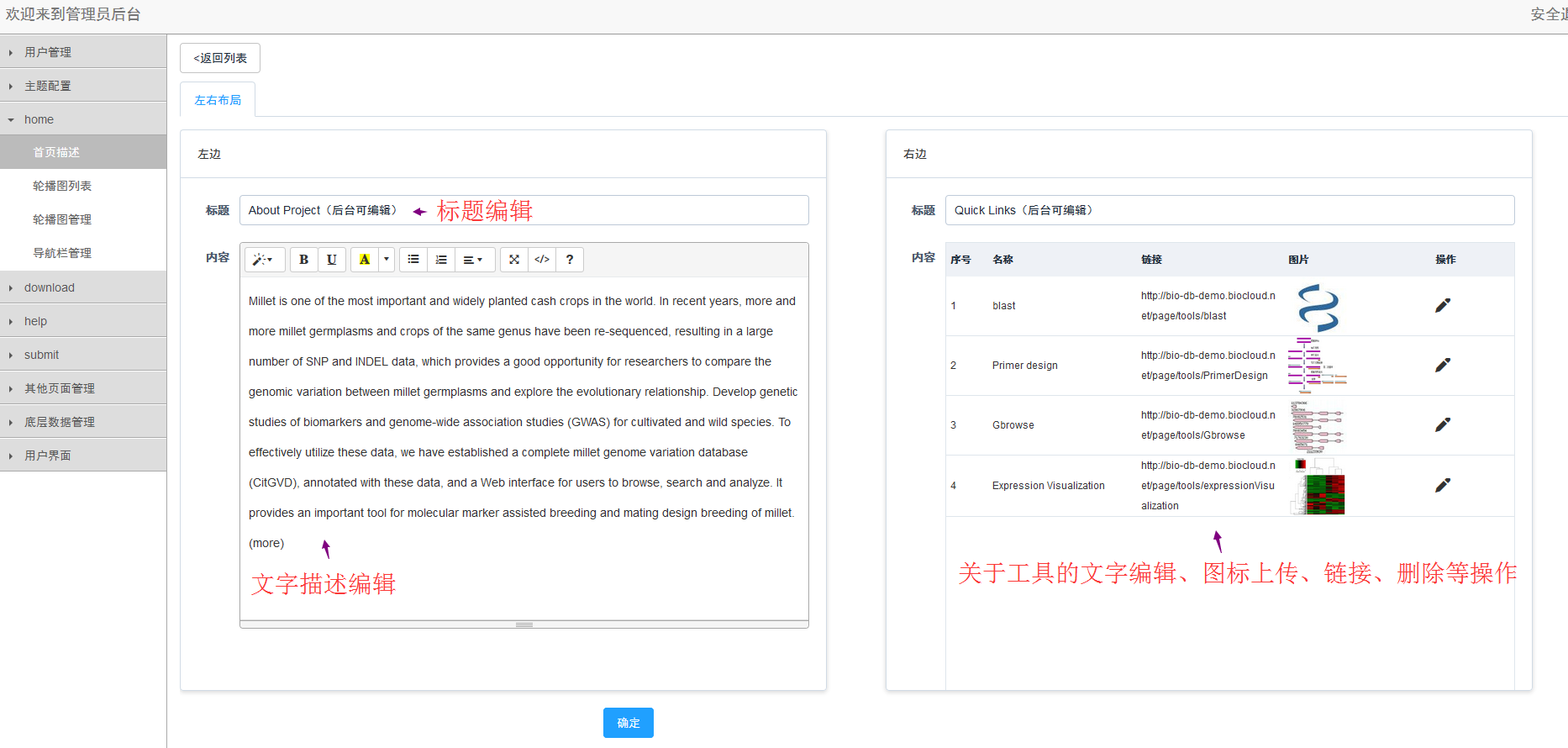 為了更好的服務(wù)于科研,物種數(shù)據(jù)庫(kù)推出了V2.0版:不但可共享研究成果,而且通過(guò)后臺(tái)管理系統(tǒng)可以完成logo、文字描述、配色、單位等信息的修改,更重要的是可以實(shí)現(xiàn)新增數(shù)據(jù)的一鍵式部署。