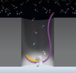 PB的測序空間為ZMW(zero-mode wave guides,零模波導(dǎo)孔),外徑100多納米,DNA分子掉入孔中,不同熒光標(biāo)記的脫氧核苷酸在聚合酶的作用下,會產(chǎn)生不同的熒光信號,隨后標(biāo)記基團自動脫落,維持了信號的持續(xù)監(jiān)測。激光從ZMW底部打入,由于孔直徑很小而不能穿過孔進入上方溶液區(qū),從而把背景噪音降到最低。