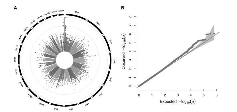 基于單個位點的EWAS分析,鑒定出136個CpG(p <1e-04),其中30個CpG(p <1e-05),2個CpG(p <1e-06)。 沒有位點達(dá)到全基因組顯著性(定義為FDR <0.05),最低FDR = 0.195。 圖中顯示了每個CpG位點的p值與其染色體位置的曼哈頓圖(圖a)和針對隨機(jī)預(yù)期p值分布繪制的預(yù)估p值的Q-Q圖(圖b)。最顯著CpG?p值表明與隨機(jī)分布的偏差及其陰影區(qū)域的95%置信區(qū)間(圖b),說明這些CpG與BMI的非隨機(jī)關(guān)聯(lián)。