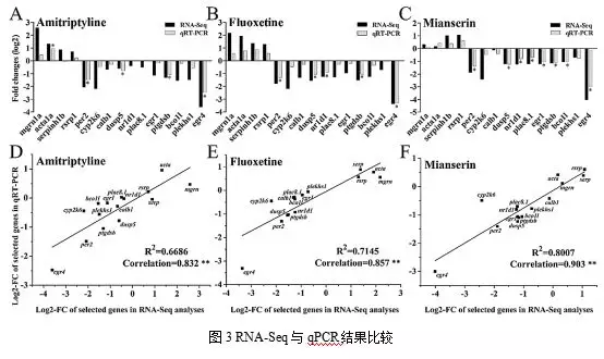 作者為了更好地了解不同種類抗抑郁藥誘導(dǎo)的毒性反應(yīng)在非靶向魚類中的作用機(jī)制,用分屬于不同抗抑郁藥物類別的阿米替林(Amitriptyline hydrochloride)、氟西汀(Fluoxetine hydrochloride)和鹽酸米安色林(mianserin hydrochloride)對早期發(fā)育階段的斑馬魚胚胎進(jìn)行處理,然后進(jìn)行了轉(zhuǎn)錄組測序(RNA-Seq),基于前面轉(zhuǎn)錄組的分析結(jié)果,作者采取兩組qPCR驗證實驗: