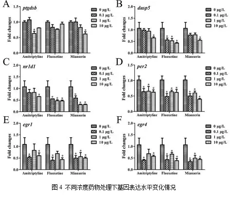 作者用三種不同濃度的抗抑郁藥(0.1、1和10 μg /L)處理斑馬魚胚胎,應(yīng)用qPCR試驗確定6個選定的基因的濃度—應(yīng)答關(guān)系。結(jié)果表明,ptgdsb的mRNA水平只在1 μg /L阿米替林和10 μg /L米安色林處理組顯著降低;而dusp5表達(dá)水平在10 μg /L阿米替林和米安色林處理組以及所有氟西汀處理組中均顯著降低;除了在1和10 μg /L阿米替林處理組中的nr1d1表達(dá)水平未受抑制之外,nr1d1和per2在幾乎所有抗抑郁藥物處理組均受到顯著抑制。此外,兩個與早期生長應(yīng)答相關(guān)的基因egr1和egr4在0.1和10 μg /L阿米替林處理組和所有米安色林處理組中表達(dá)下調(diào),egr4在所有氟西汀處理組降低,而egr1只在0.1和10 μg /L氟西汀處理組中表達(dá)降低(圖4)。