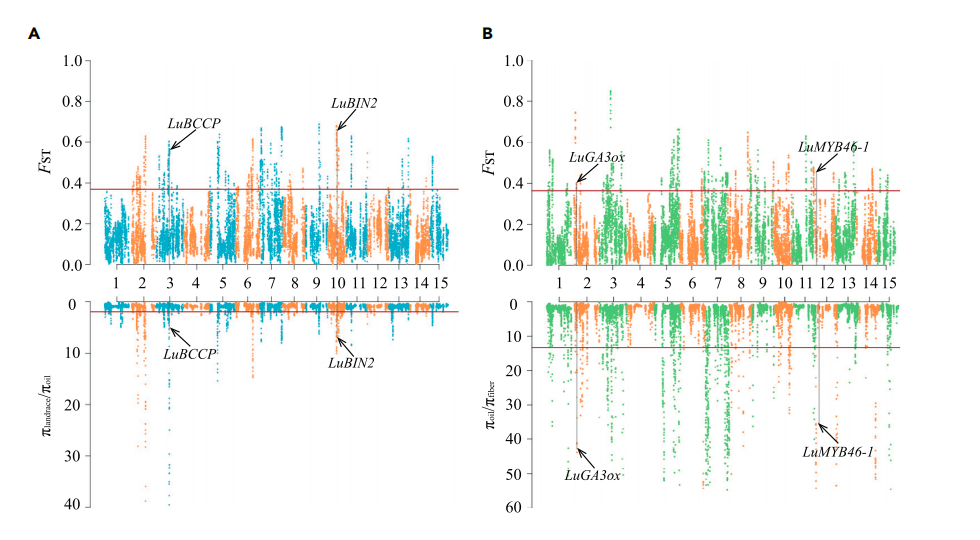 作物改良常常導(dǎo)致受選擇的區(qū)域核酸多態(tài)性降低,將油用亞麻群體和纖維亞麻群體分別與地方種比較分析,油用亞麻中檢測(cè)到108個(gè)選擇清除區(qū)域(長(zhǎng)度為15.5Mb,1,958個(gè)基因),纖維亞麻中有60個(gè)選擇清除區(qū)域(長(zhǎng)度為8.2Mb,1018個(gè)基因),27個(gè)選擇清除區(qū)域重疊。其中α生物素羧基載體蛋白(LuBCCP)、脂氧合酶(LuLOX)、脂肪?;鵄CP硫酯酶A(LuFatA)、脂質(zhì)轉(zhuǎn)移蛋白(LuLTP)和丙酮酸脫氫酶復(fù)合物E2組分(LuPDH-E2)等油脂相關(guān)基因以及種子大小相關(guān)基因LuBIN2和LuGW5在油用亞麻中受到選擇。纖維亞麻中,次生細(xì)胞壁生物合成相關(guān)基因(LuMYB46-1、LuXTH和LuROPGAP3)和植物株高相關(guān)基因(LuGA3ox、LuGA20ox和LuGID)受到選擇。