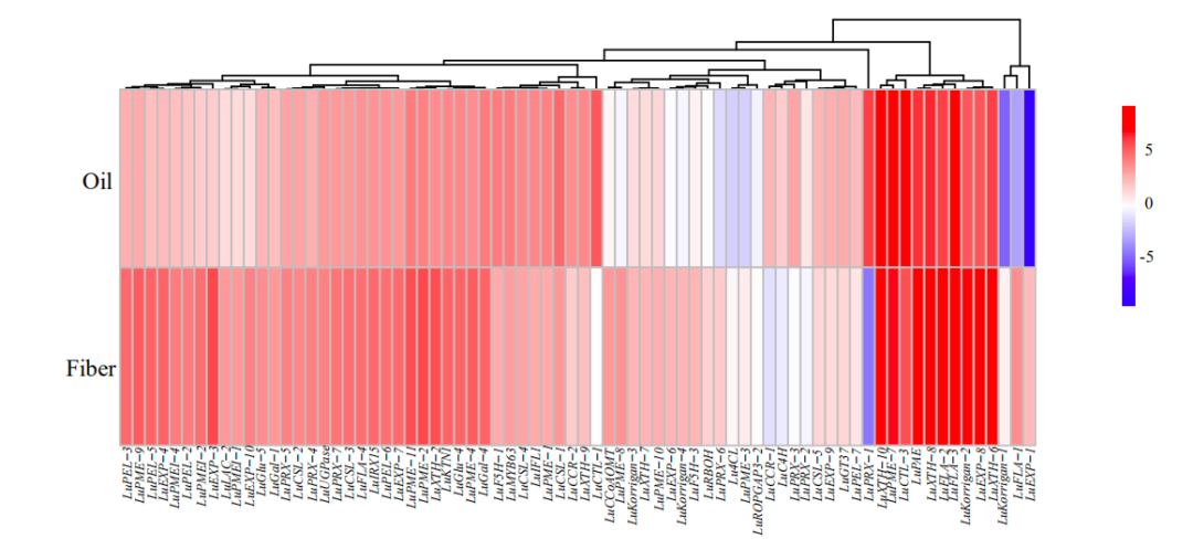 之前有報(bào)道纖維亞麻是從油用亞麻馴化而來,將油用亞麻與纖維亞麻進(jìn)行比較分析,存在47個(gè)選擇清除區(qū)域,其中50.9%與纖維亞麻相對(duì)于地方種的選擇區(qū)域重合。這表明在纖維用亞麻改良過程中,這些區(qū)域持續(xù)受到很強(qiáng)的選擇壓力。大約一半的基因(426/867個(gè)基因)僅在油用亞麻和纖維亞麻比較中發(fā)現(xiàn),包含內(nèi)切-β-1,4-葡聚糖酶(LuKorrigan)、果膠甲酯酶(LuPME)和焦磷酸銅合成酶(LuCPS)等。作者將選擇清除區(qū)域與之前報(bào)道的QTL/GWAS位點(diǎn)比較分析,發(fā)現(xiàn)2個(gè)硬脂酸相關(guān)的QTL與油用亞麻選擇區(qū)域重疊,一個(gè)株高相關(guān)的GWAS位點(diǎn)與纖維亞麻選擇區(qū)域重疊,另外3個(gè)油合成相關(guān)的QTL與纖維亞麻選擇區(qū)域重疊,這說明亞麻在馴化過程中受到雙重選擇。