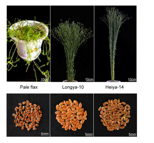 對(duì)油用亞麻品種Longya-10、纖維亞麻品種Heiya-14和pale flax分別測(cè)序得到68.2Gb,73.5Gb和 49.1Gb數(shù)據(jù),組裝出306.0Mb、303.7Mb和293.5 Mb基因組,其中contig N50/scaffold N50分別為131Kb/ 1,235Kb, 156Kb/700Kb和59Kb/384 Kb,后期利用HiC技術(shù)與遺傳圖譜輔助Longya-10基因組組裝,將434 scaffolds組裝至染色體水平,在每個(gè)基因組中預(yù)測(cè)到大約43,500個(gè)編碼基因和2600-2800個(gè)非編碼RNA;系統(tǒng)發(fā)育分析表明,栽培亞麻和白亞麻在大約232萬年前發(fā)生了分化,自古被子植物的六倍化事件以來,亞麻發(fā)生了兩次全基因組復(fù)制事件。