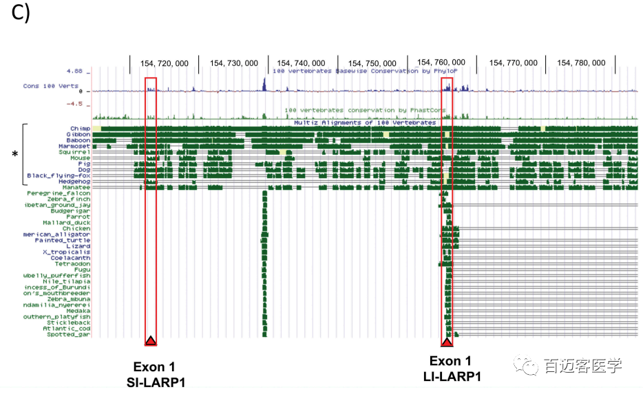 接下來,作者對(duì)SI-LARP1是否可以發(fā)揮獨(dú)特的功能作用感興趣。為此分析了2種LARP1亞型的TSS區(qū)保守水平(圖5C)。作者假設(shè),進(jìn)化保守將暗示選擇性壓力,因此每種亞型的作用不同。為了解釋LARP1亞型的進(jìn)化保守性,使用UCSC基因組瀏覽器在脊椎動(dòng)物(鳥類、魚類、兩棲動(dòng)物、爬行動(dòng)物、哺乳動(dòng)物)亞門上生成了100個(gè)可用LARP1序列的多序列比對(duì)。出乎意料的是,LI-LARP1外顯子1在整個(gè)亞科中都具有很強(qiáng)的保守性,但SI-LARP1外顯子1的保守性僅存在于胎盤動(dòng)物分支中,其中包括人類和其他靈長(zhǎng)類動(dòng)物。這表明它可能在胎盤哺乳動(dòng)物的進(jìn)化晚期獲得了功能性作用。相比之下,LI-LARP1的保守性跨多個(gè)進(jìn)化分支表明作用更為古老。