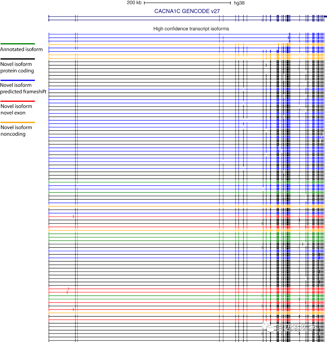 通過設(shè)置轉(zhuǎn)錄本的高置信度,在6個大腦區(qū)域確定了90個高可信的CACNA1C轉(zhuǎn)錄本,包括7個先前注釋的(GENCODE V27)和83個新的(補充圖3)。7個新的高置信度轉(zhuǎn)錄本包含新的外顯子,而其余76個包含以前未描述的連接和連接組合。