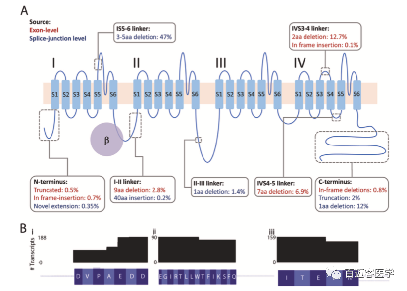 CACNA1C編碼CaV1.2 的主要成孔亞基。鈣孔由24個跨膜重復(fù)序列組成,由細胞內(nèi)環(huán)連接成4個結(jié)構(gòu)域(I-IV)(圖4A)。在我們鑒定的83個新的外顯子水平的轉(zhuǎn)錄本中,51個可能編碼功能性的CaV1.2通道。灰色方框表示新的、框架內(nèi)的插入和刪除的位置(值表示包含每個isoforms的reads的平均比例)。使用兩種分析方法(外顯子水平和剪切連接水平)鑒定變體的情況,外顯子水平計數(shù)用于得出豐度(紅色文本);僅使用剪接位點水平方法鑒定的變體用藍色文本表示。包含三個微缺失的蛋白質(zhì)異構(gòu)體的數(shù)量:(I)在I-II接頭中,(Ii)在IV4-5接頭中,以及(Iii)在IV3-4接頭中先前報道的微缺失(圖4B)。