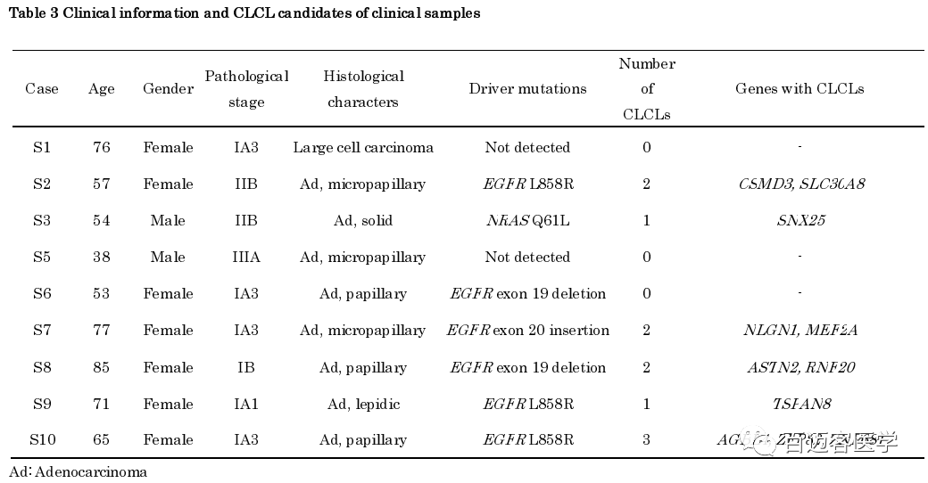 為了檢查臨床肺癌肺腺癌病例中是否也存在CLCL,對9名日本肺腺癌患者的手術標本進行了類似的PromethION全基因組測序(表3)。表3中顯示了每個患者所檢測到的驅動基因突變。平均每個case生成了43,953,136,203 bp的序列(深度大于10倍)。對于S10病例,還對正常組織標本進行了測序,以消除可能的正常組織變異和源自比對錯誤的可疑CLCL。